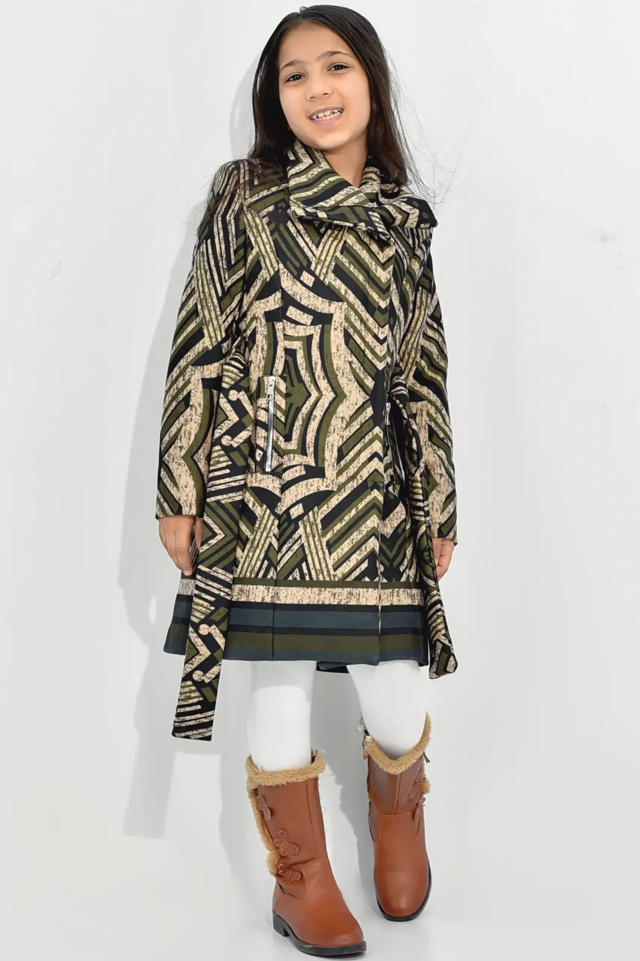بالطو بناتي جوخ مطبوع مبطن ستان كاكي : الأناقة والدفء في تصميم واحد