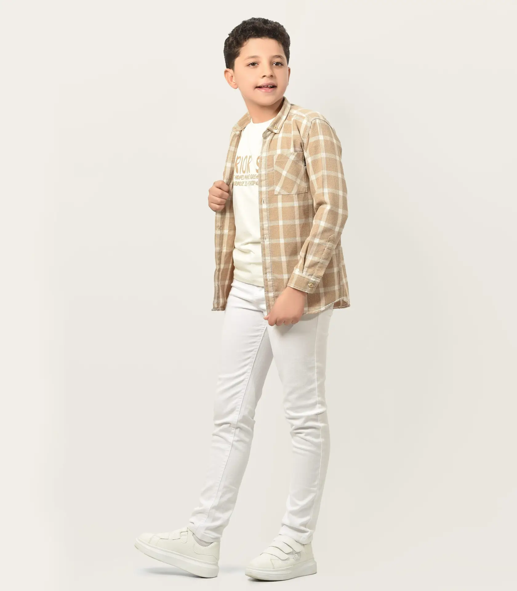 توينز أولادي يتكون من قميص كاروه بألوان جذابة مع تفاصيل عصرية، و تيشيرت نصف كم بيج مريح. هذه المجموعة تمنح طفليكِ إطلالة متناسقة وعصرية، بينما توفر لهم الراحة التامة طوال اليوم. القميص الكاروه يتميز بتصميمه الجذاب الذي يضيف لمسة من المرح، بينما يوفر التيشيرت البيج راحة كبيرة وحركة سهلة بفضل تصميمه البسيط.